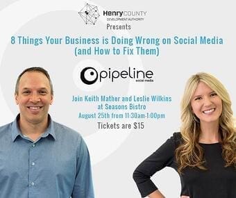 The Henry County Development Authority invites all business owners to attend our second in a series of four business luncheons! Our second business luncheon in Henry County will take place on August 25th at Seasons Bistro from 11:30 AM – 1 PM. The topic will be “8 Things Your Business is Doing Wrong on Social Media (and How to Fix Them).” The luncheon will be led by Leslie Wilkins and Keith Mather of Pipeline Social Media. Tickets for the luncheon cost $15 per person and can be purchased by following the registration link located at the bottom of the page.